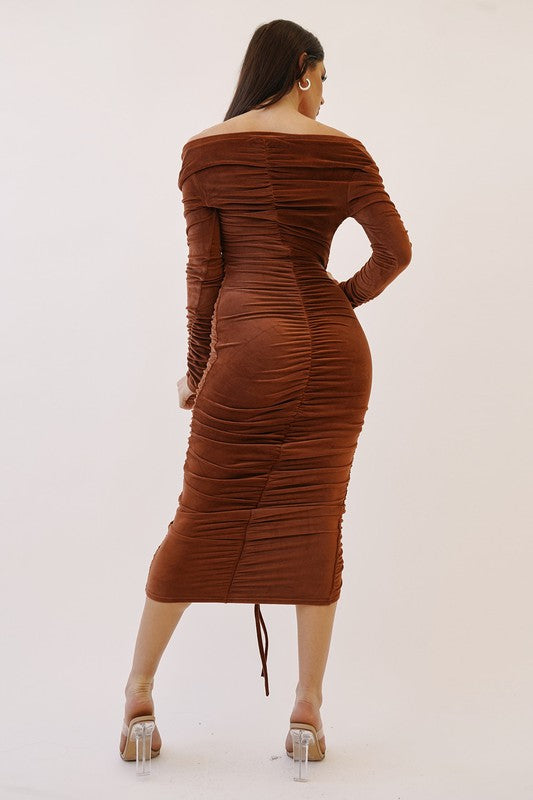 Elegantly ruched velour midi with detail string front. Our Chocolate Dreams Midi Dress contours to the body in a soft velour fabric. Comes in a beautiful chocolate brown color. Perfect for date night with your Hunny, party or a night out with your girls. Add this beauty to your cart!!